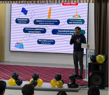№180 мектеп-гимназиясында Study First компаниясының қатысуымен 9–11 сынып оқушыларына арналған кәсіптік бағдар беру кездесуі өткізілді.