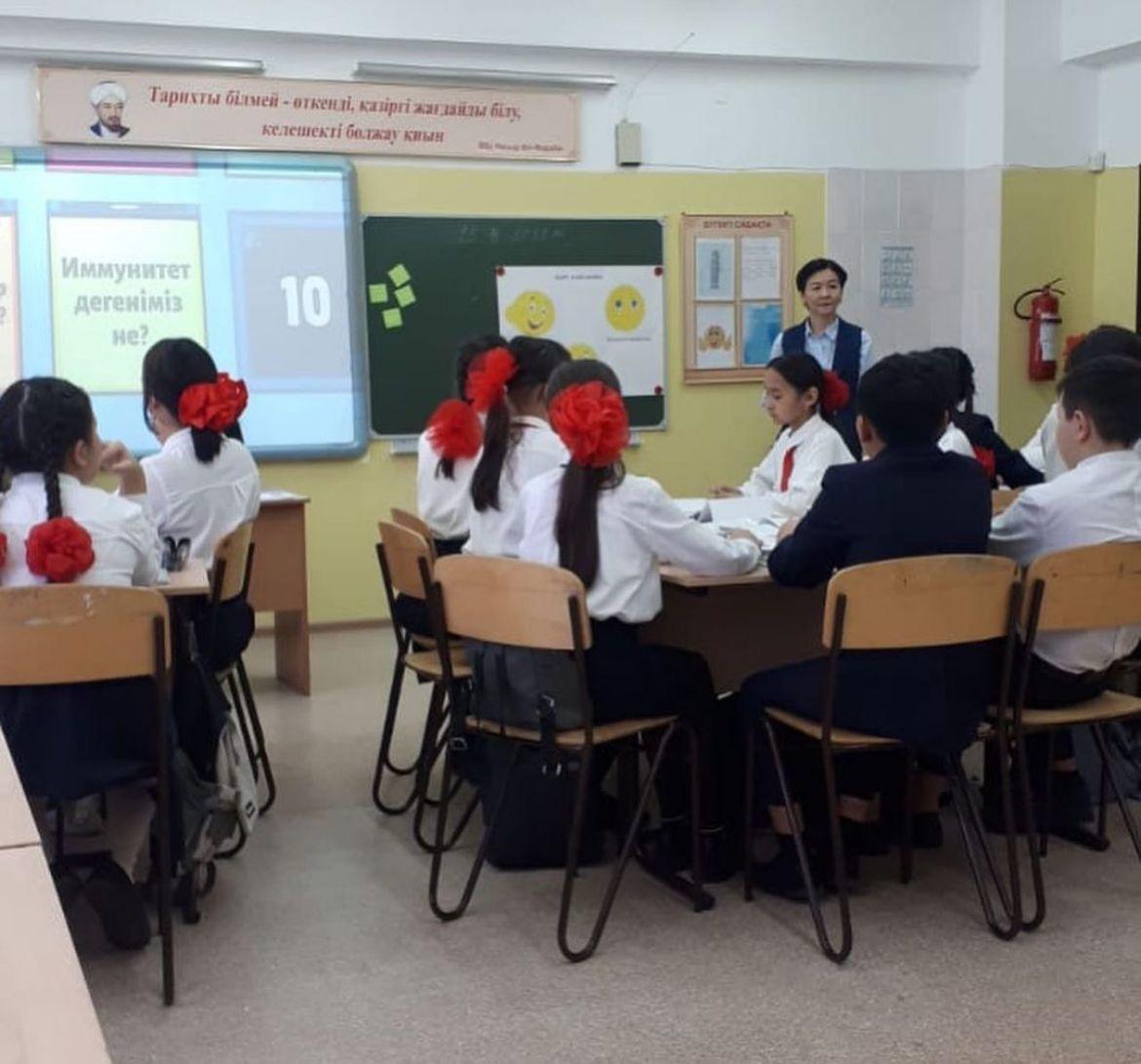 Балакойшиева Карагоз Рысбаевна "Жұқпалы аурулар және олардың алдын-алу шаралары " тақырыбында 8 "Д" сынып оқушыларымен ашық сабақ өткізді.