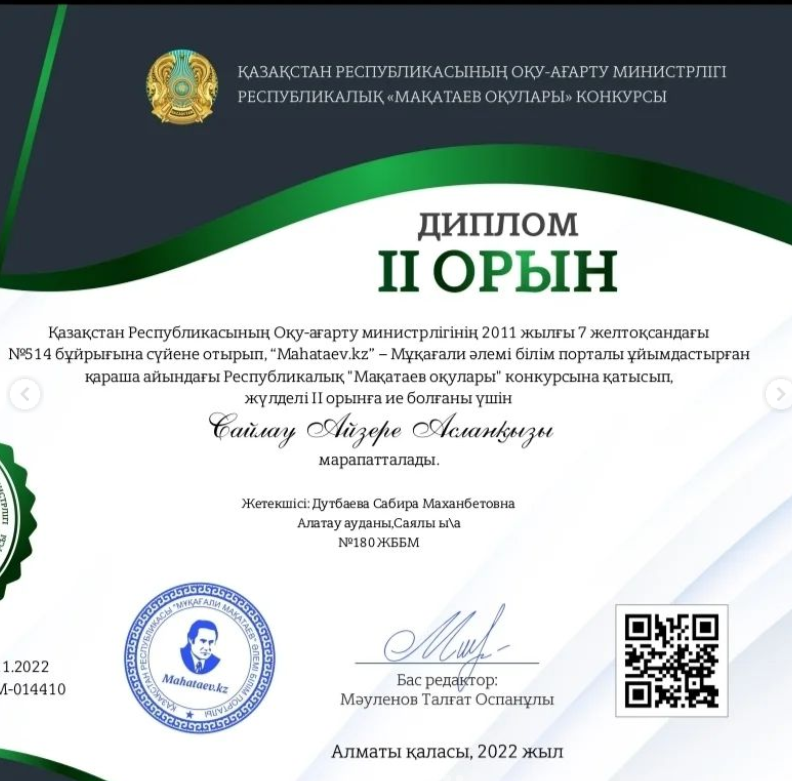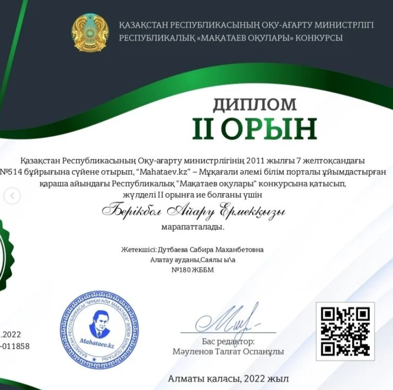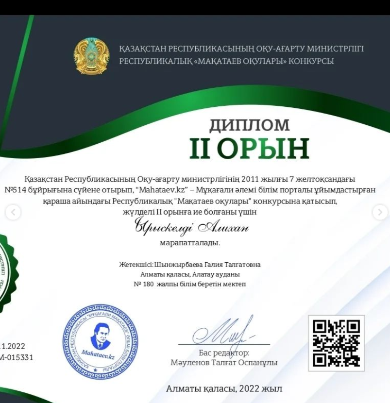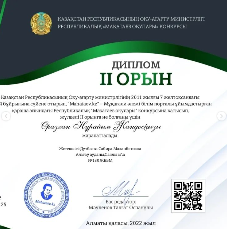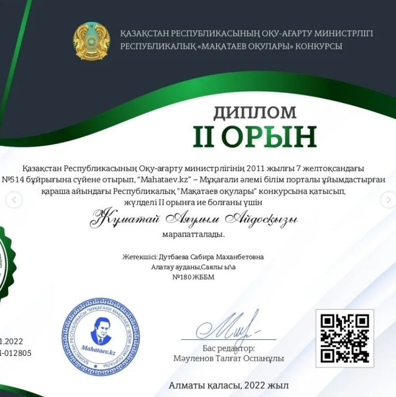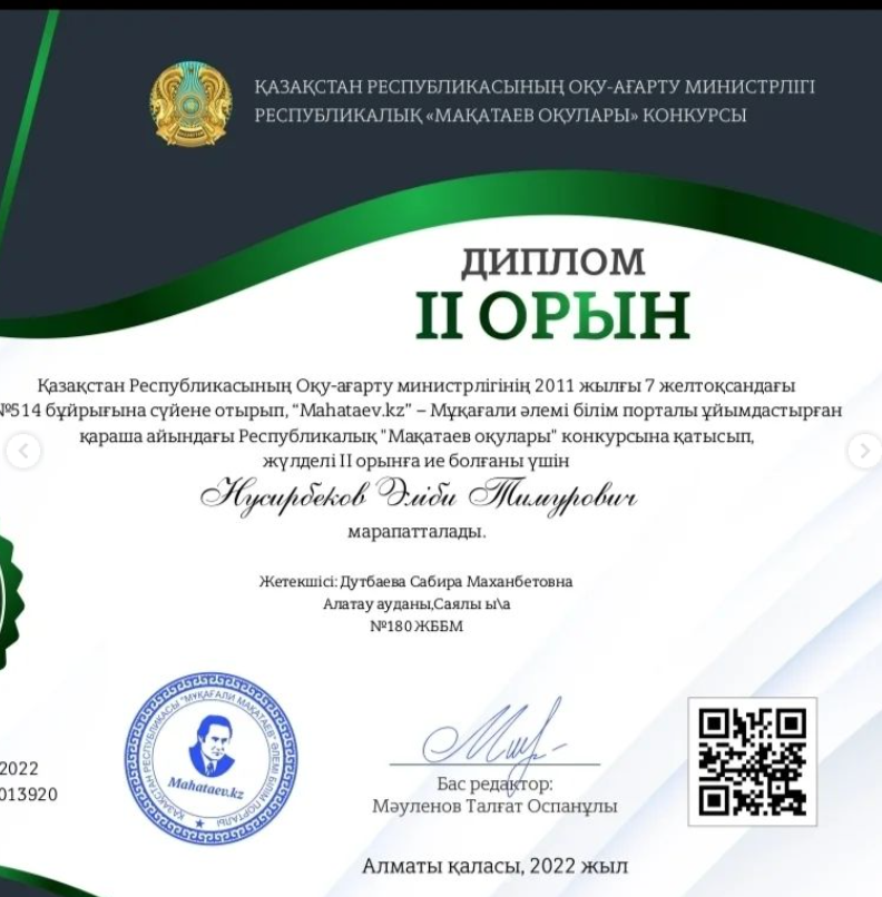 Қазақстан Республикасының Оқу-ағарту министрлігінің бастамасымен, "Мұқағали әлемі" білім порталы ұйымдастырған қараша айындағы Республикалық "Мақатаев оқулары" конкурсына қатысып, бастауыш және жоғары сынып оқушылары жүлделі орындарға ие болды.Бастауыш сыныптары арасында Оспан Жансая, Сайлау Айзере, Оразхан Нұрайым, Нусирбеков Әліби, Жұматай Аяулым, Берікбол Айару, Бейсеу Жігер, Ахметов Асылбек жүлделі II орынға ие болды. Жетекшісі Дутбаева Сабира Маханбетовна.Жоғары сыныптар арасында 7 "ж" сыныбының оқушысы Асылбай Ерасыл I орынға ие болса, 7 "ж" сыныбының оқушысы Ахметов Диас, 7 "е" сынып оқушысы Жақсылық Ақжарқын, 5 "ж" сыныбының оқушысы Ырыскелді Алихан жүлделі II орынға ие болды. Жетекшісі Шынжырбаева Ғалия Талғатовна.