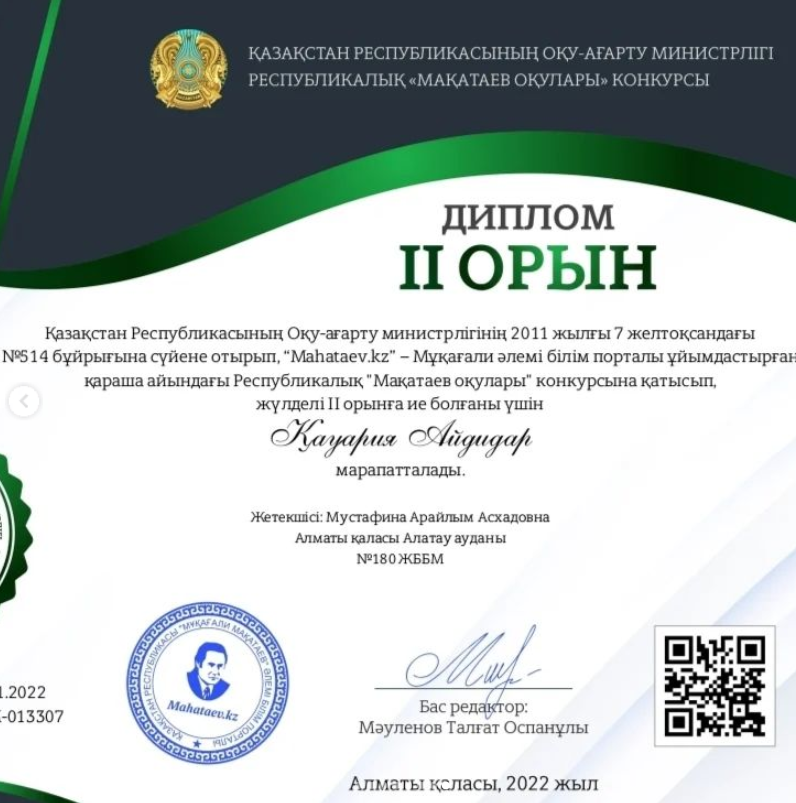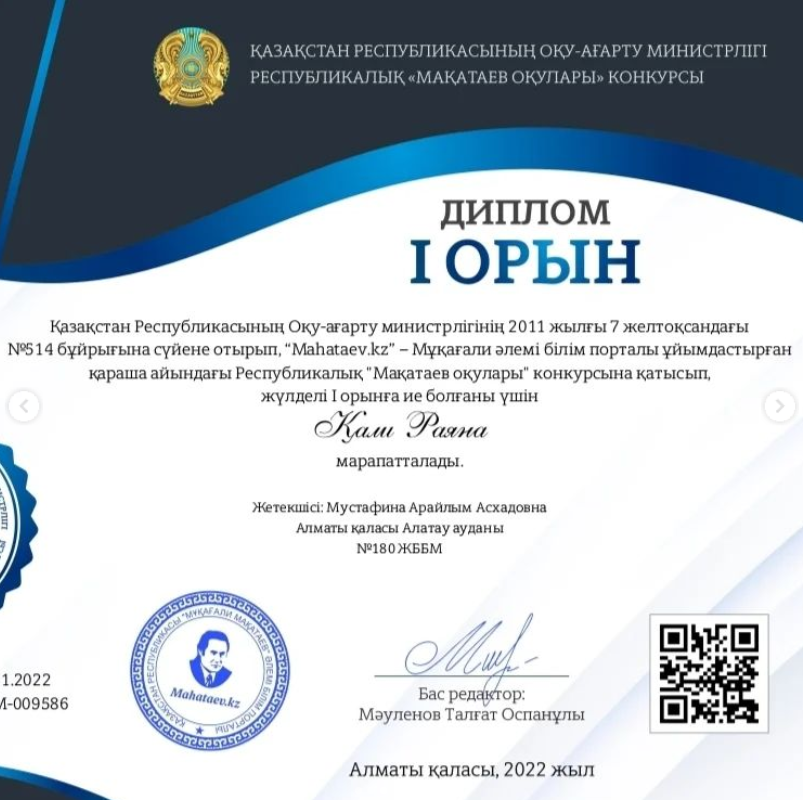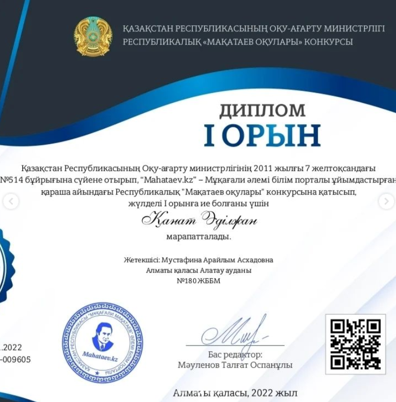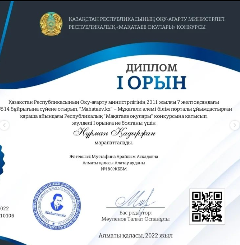 Қазақстан Республикасының Оқу-ағарту министрлігінің бастамасымен, "Мұқағали әлемі" білім порталы ұйымдастырған қараша айындағы Республикалық "Мақатаев оқулары" конкурсына 1" Ә" сынып оқушылары қатысып жүлделі орындарға ие болды. Қали Раяна,Марат Жан,Хамидулла Кәусар,Нұрман Қадыржан,Қанат Әділжан жүлделі І-орын, Дарханқызы Айзере,Қауария Айдидар жүлделі ІІ-орынды иеленді.Жетекшісі Мустафина Арайлым Асхадовна Құрмет грамотасымен марапатталды.