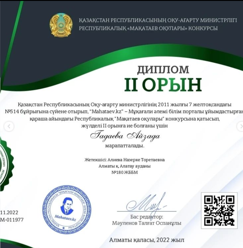 Қазақстан Республикасының Оқу-ағарту министрлігінің бастамасымен, "Мұқағали әлемі" білім порталы ұйымдастырған қараша айындағы Республикалық "Мақатаев оқулары" конкурсына 2" Ғ" сынып оқушылары қатысып жүлделі орындарға ие болды. Жұмағұл Дінмұхаммед,Жайнар Раяна,Мамбетова Раян,Ерген Олжас,Гадаева Айзада,Ерлікқызы Айару ,Рахыш Іңкәр жүлделі ІІ-орынды иеленді.Жетекшісі Алиева Назерке Торетаевна Құрмет грамотасымен марапатталды.