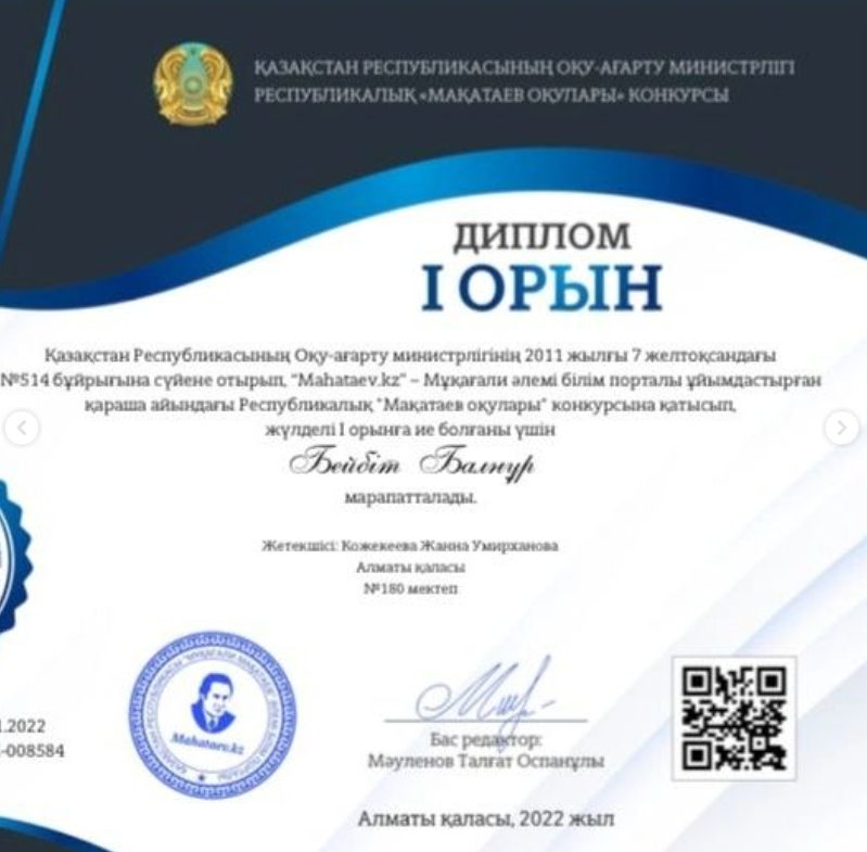 Қазақстан Республикасының Оқу-ағарту министрлігінің бастамасымен, "Мұқағали әлемі" білім порталы ұйымдастырған қараша айындағы Республикалық "Мақатаев оқулары" конкурсына 2" Е" сынып оқушылары қатысып , жүлделі орындарға ие болды. Сәкен Дінмұхаммед, Бейбіт Балнұр жүлделі