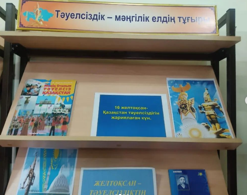 Тәуелсіздігіміздің 31 жылдығына орай мектеп кітапханасында «Тәуелсіздік – мәңгілік елдің тұғыры» атты көрме ұйымдастырылып, 8 «Б» сынып білім алушыларына таныстырылды.