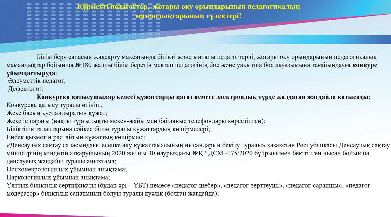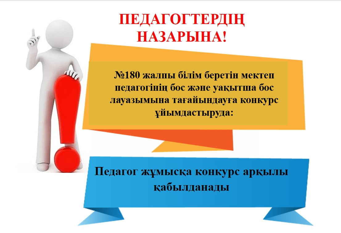 Білім беру сапасын жақсарту мақсатында білікті және ынталы педагогтерді, жоғары оқу орындарының педагогикалық мамандықтар бойынша №180 жалпы білім беретін мектеп педагогінің бос және уақытша бос лауазымына тағайындауға конкурс ұйымдастыруда: Әлеуметтік педагог және дефектолог.