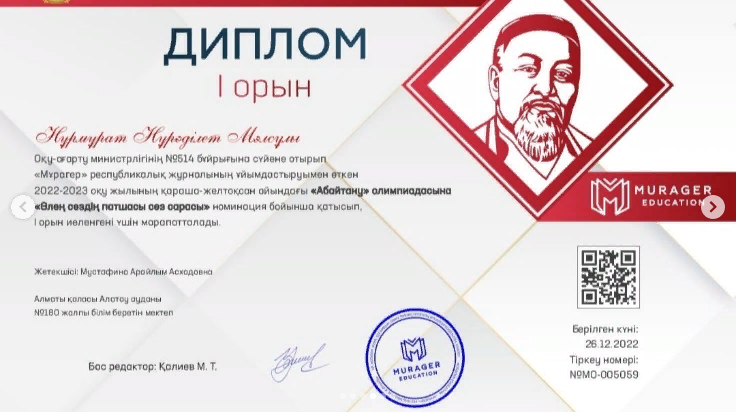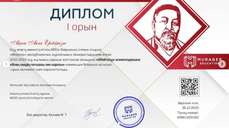 Оқу-ағарту министірлігінің 514 бұйрығына сүйене отырып,"Мұрагер"республикалық "Абайтану" олимпиадасының "Өлең сөздің патшасы сөз сарасы"номинациясы бойынша 1 "Ә"сынып оқушылары қатысып, жүлделі орындарға ие болды.Марат Жан Бас жүлде,Ерғанат Бекарыс Бас жүлде,Ақан Аяла 1 орын,Нұрмұрат Нұрәділет 1 орын,Бауыржан Меруерт 2 орын.Сынып жетекшісі Мустафина Арайлым Асхадовна Құрмет грамотасымен марапатталды.