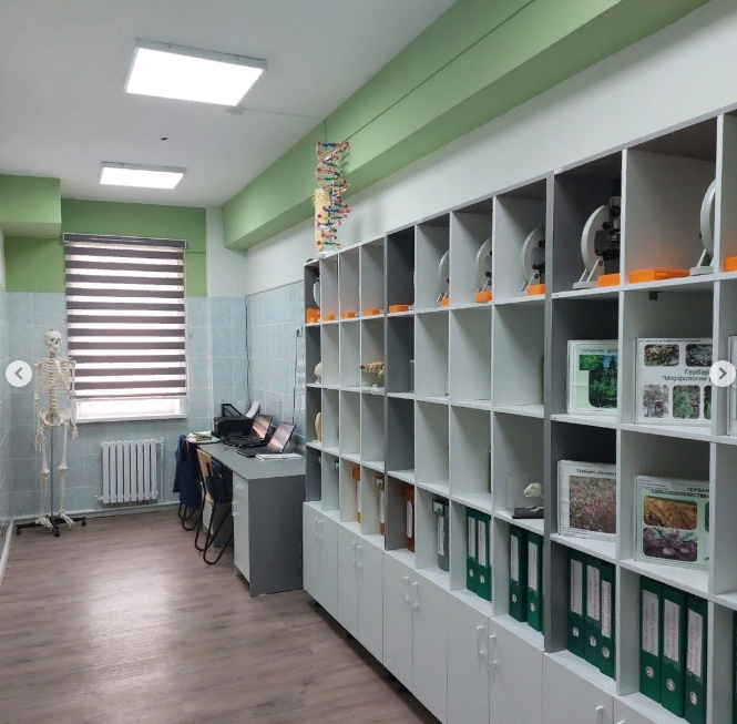 Мектептерді модернизациялау және жабдықтау жөніндегі «Көркем» компаниясы жеке авторлық дизайн жобасының үлгісі негізінде биология кабинетін заманауи талаптарға сай жабдықтаған. Оқу кабинеті жаңартылған білім аясында білім алушыға жан-жақты білім алуға мүмкіндік беруде.