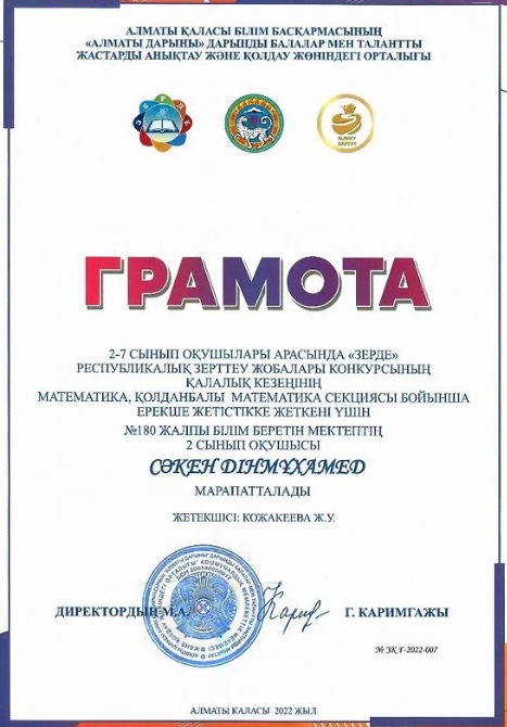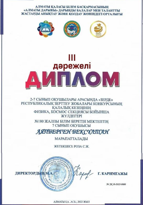 2-7 сынып оқушылары арасында "Зерде" Республикалық зерттеу жобалары конкурсының қалалық кезеңдерінен мектебіміздің оқушылары жүлделі орындарға ие болды. Атап айтсақ ағылшын тілі секциясы бойынша Ақиқат Батырхан III дәрежелі дипломға ие болса, Оразхан Нұрайым арнайы грамотамен мараппатталды. Физика, космос секциясы бойынша Аяпберген Бексұлтан III дәрежелі дипломға ие болды. Математика, қолданбалы математика секциясы бойынша Сәкен Дінмұхаммед арнайы грамотаға ие болды. Жарыс жүлдегерлерін құттықтаймыз!