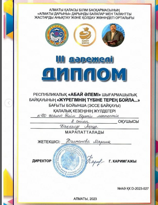 Республикалық “Абай әлемі” шығармашылық байқауының “Жүрегімнің түбіне терең ойла…” бағыты бойынша (эссе байқауы) қалалық кезеңінде 8 “А” сынып оқушысы Бақкелді Ақнұр IІI дәрежелі дипломмен марапатталды.