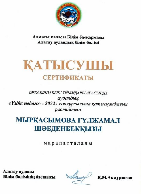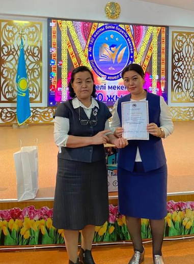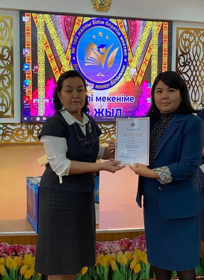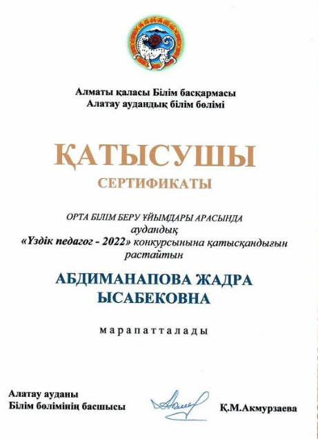 2023 жылдың 8 ақпан күні ағылшын пәнінің мұғалімі Абдимаханова Арайлым Бахтыбаевнаға, қазақ тілі мен әдебиеті пәнінің мұғалімі Мырқасымова Гүлжамал Шәбденқызына, тарих пәнінің мұғалімі Абдиманапова Жадра Ысабековнаға, география пәнінің мұғалімі Оналбаева Ляззат Болаткановнаға Алматы қаласының Алатау аудандық білім бөлімі орта білім беру ұйымдары арасында аудандық "Үздік педагог-2022" конкурсына қатысқандығын растайтын сертификат табыс етілді.