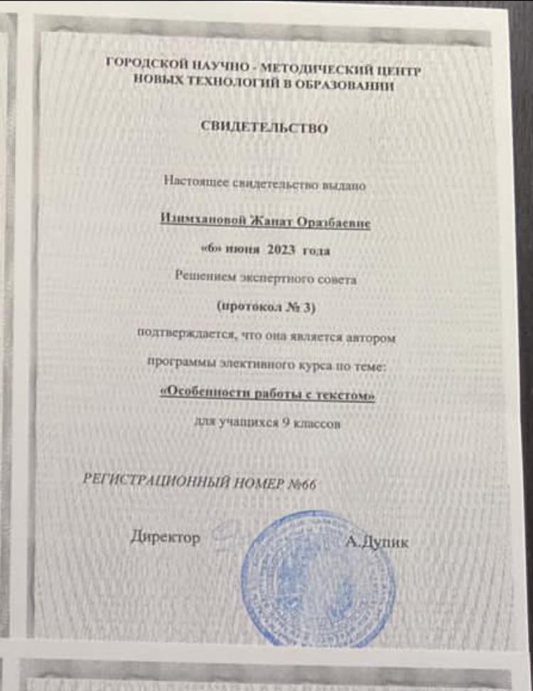 2023 жылы 15 қыркүйек күні мектебіміздің орыс тілі мен әдебиеті пәні мұғалімдері Изимханова Жанат Оразбаевна, Шайжанова Алия Токбергеновна Қалалық білім берудегі жаңа технологиялардың ғылыми әдістемелік оралығының 2023 жылы 6 маусымдағы Сараптамалық кеңестің шешімімен 9 сынып оқушыларына арналған «Особенности работы с текстом» тақырыбындағы элективті курс бағдарламасы оқу үрерісіне енгізу үшін мақұлданды. Мектептің таңғы саптық жиынында мектеп директоры Ләззәт Байшымырқызы ұстаздарды құттықтап, толағай табыс тіледі.