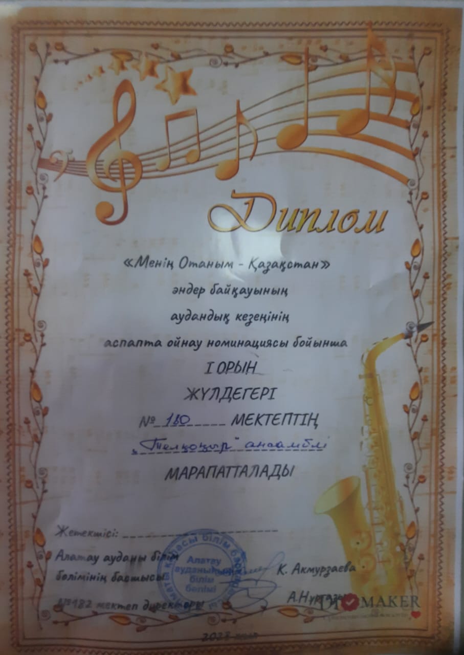 2023 жылы 24 қазан күні «25 қазан – республика күні» мерекесіне орай «Менің Отаным-Қазақстан» әндер байқауының аудандық кезеңінің аспапта ойнау номинациясы бойынша мектебіміздің «Телқоңыр» ансамблі жүлделі I орынды иеленіп, қалалық кезеңге жолдама алды. Жетекшісі: Кузбаева Фарида Мадиярханқызы. Жеңісті күндер көп болсын!