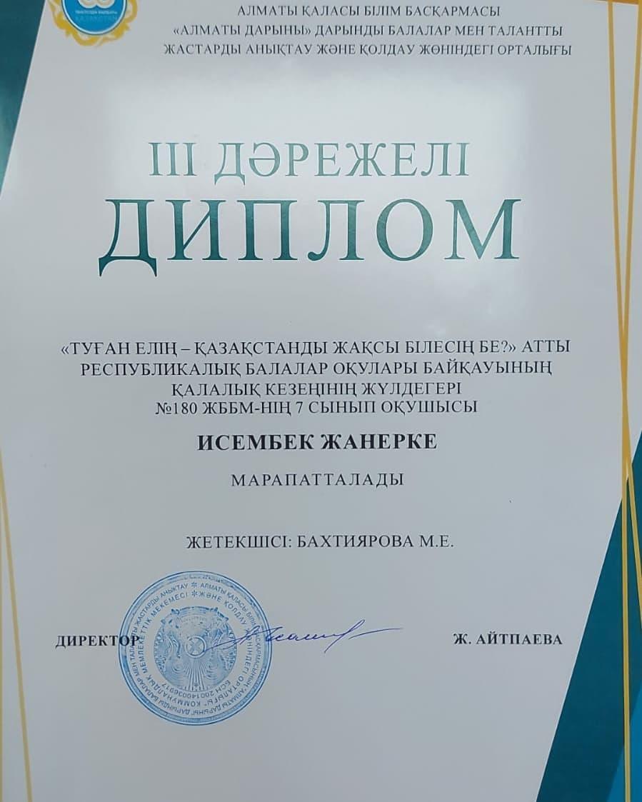 №180 жалпы білім беретін мектептен 7 «А» сынып оқушысы Исенбек Жанерке осы байқаудың қалалық кезеңінің ІІІ дәрежелі Дипломымен марапатталды.