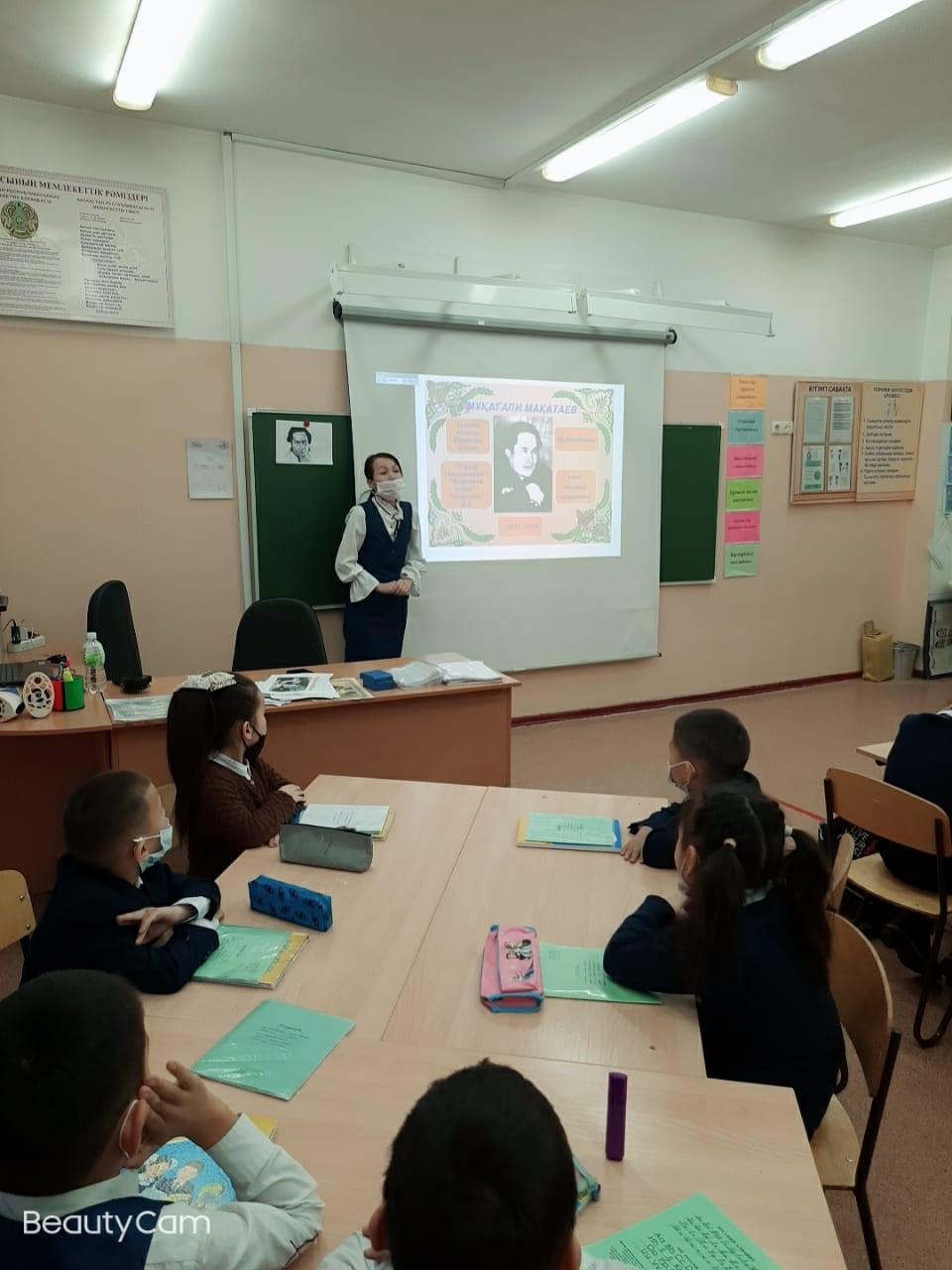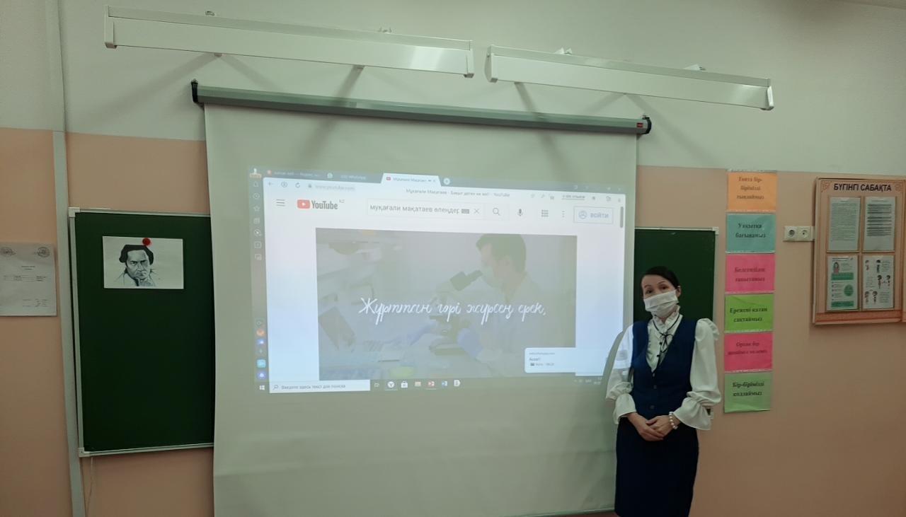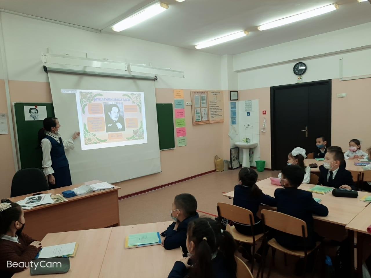 М.Мақатаевтың туған күніне орай "Жырлайды жүрек" тақырыбында 1 "Г" сынып жетекшісі Кадирова Ж.А сынып сағатынын өткізді.