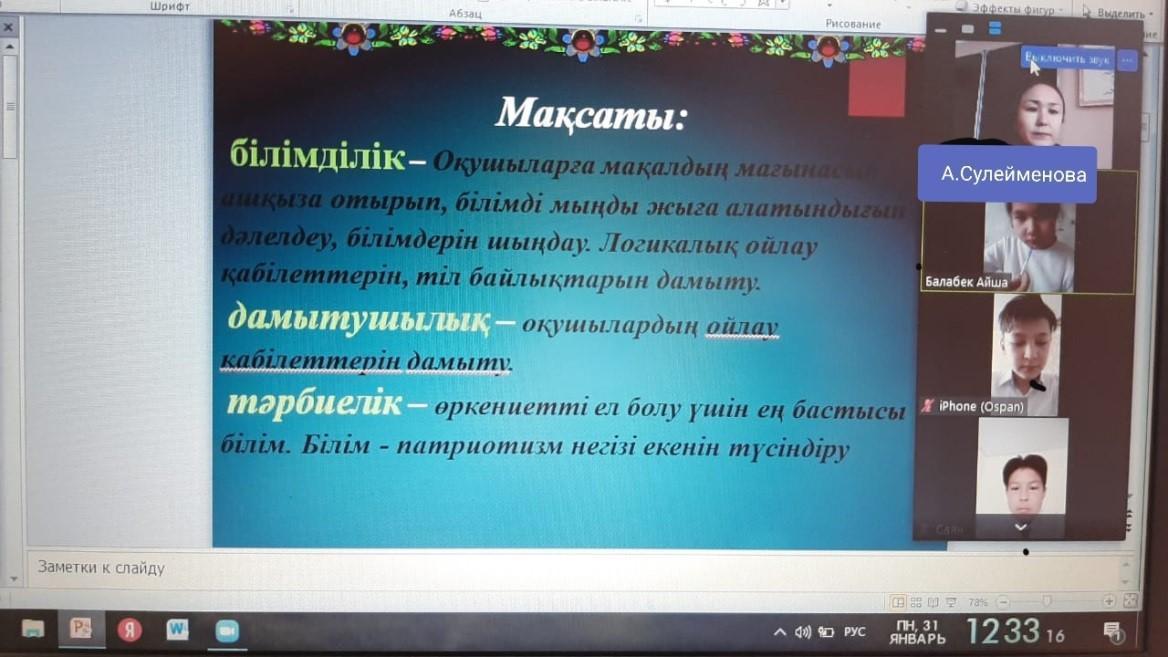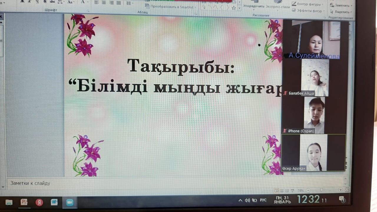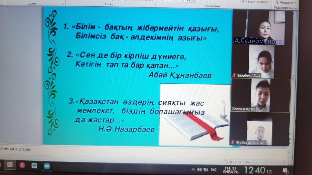 №180 жалпы білім беретін мектепте 7 «И» сыныбының сынып жетекшісі Сулейменова Асель Даулетовна 7 «И» сынып оқушыларымен ZOOM платформасы арқылы қашықтан «Білімді мыңды жығар» тақырыбында сынып сағаты өтілді.