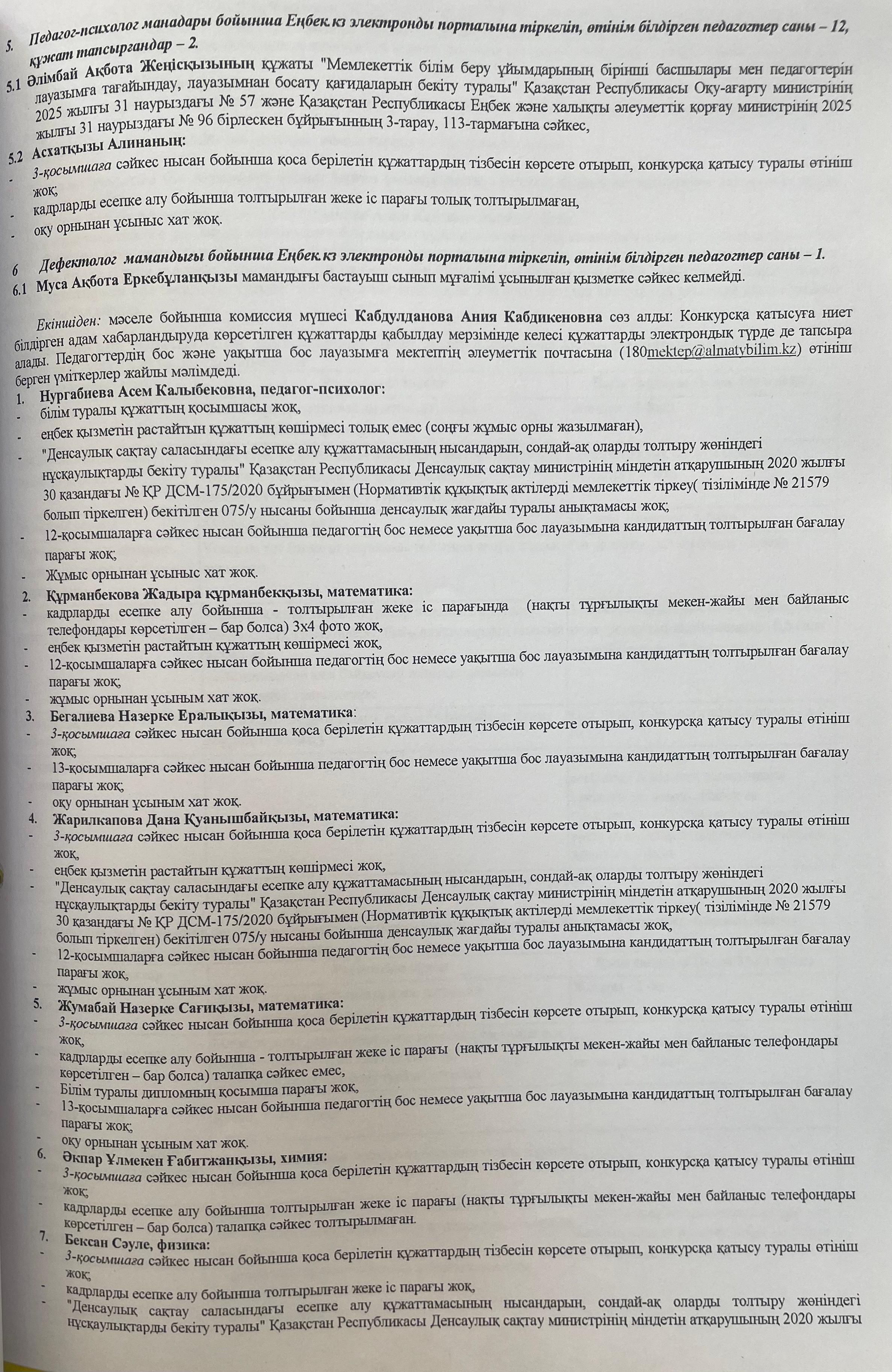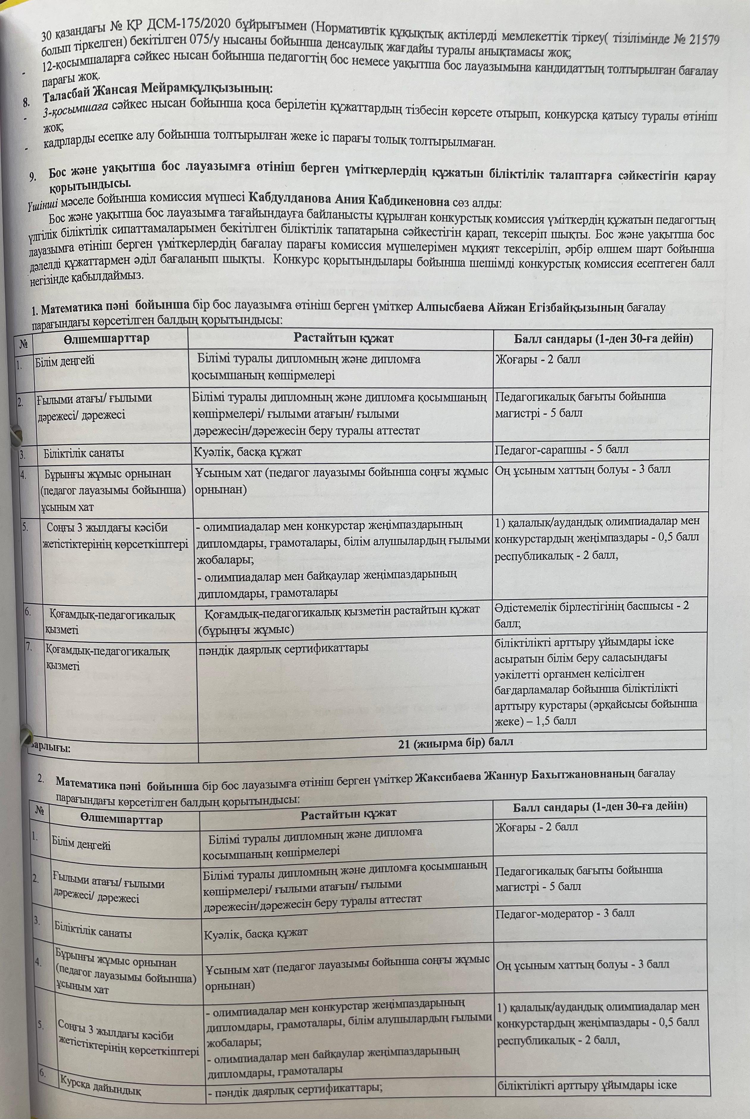 Бос және уақытша бос лауазымға тағайындауға байланысты өткізілген конкурстық комиссия отырысының хаттамасы » 180 мектеп