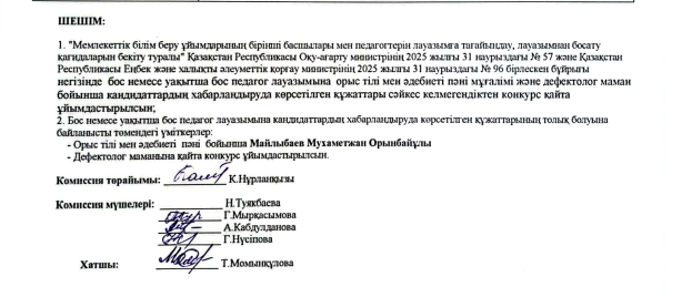 » » » Бос және уақытша бос лауазымға тағайындауға байланысты өткізілген конкурстық комиссия отырысының хаттамасы