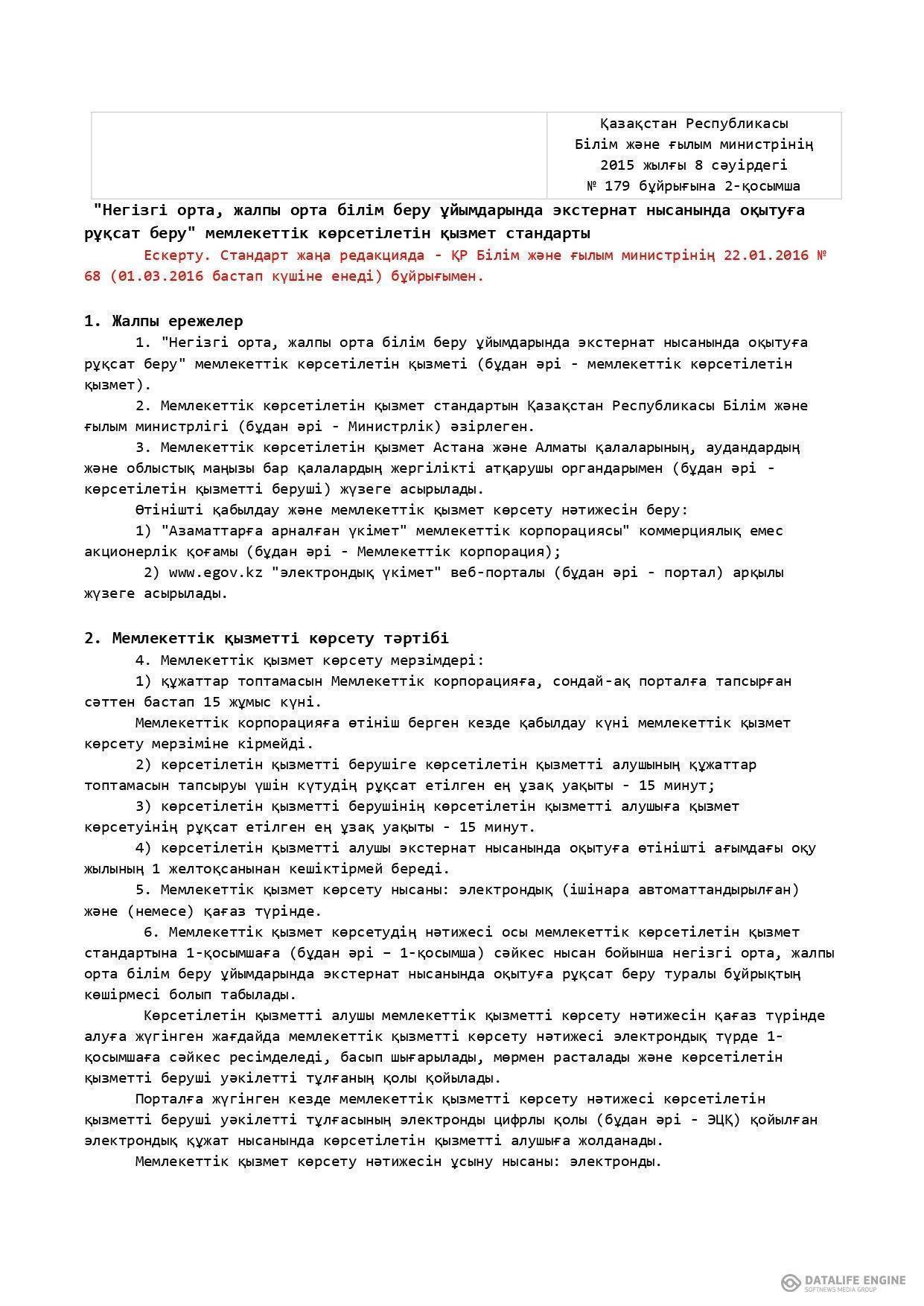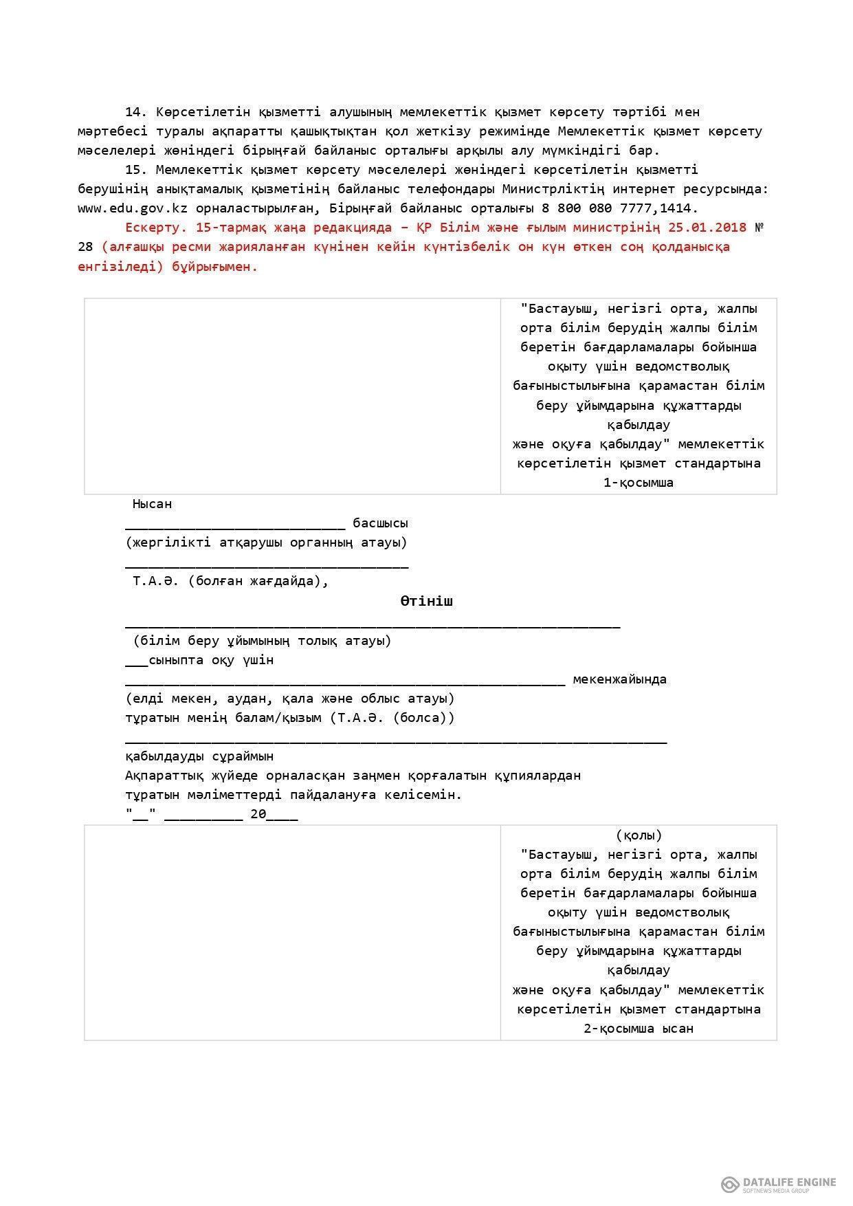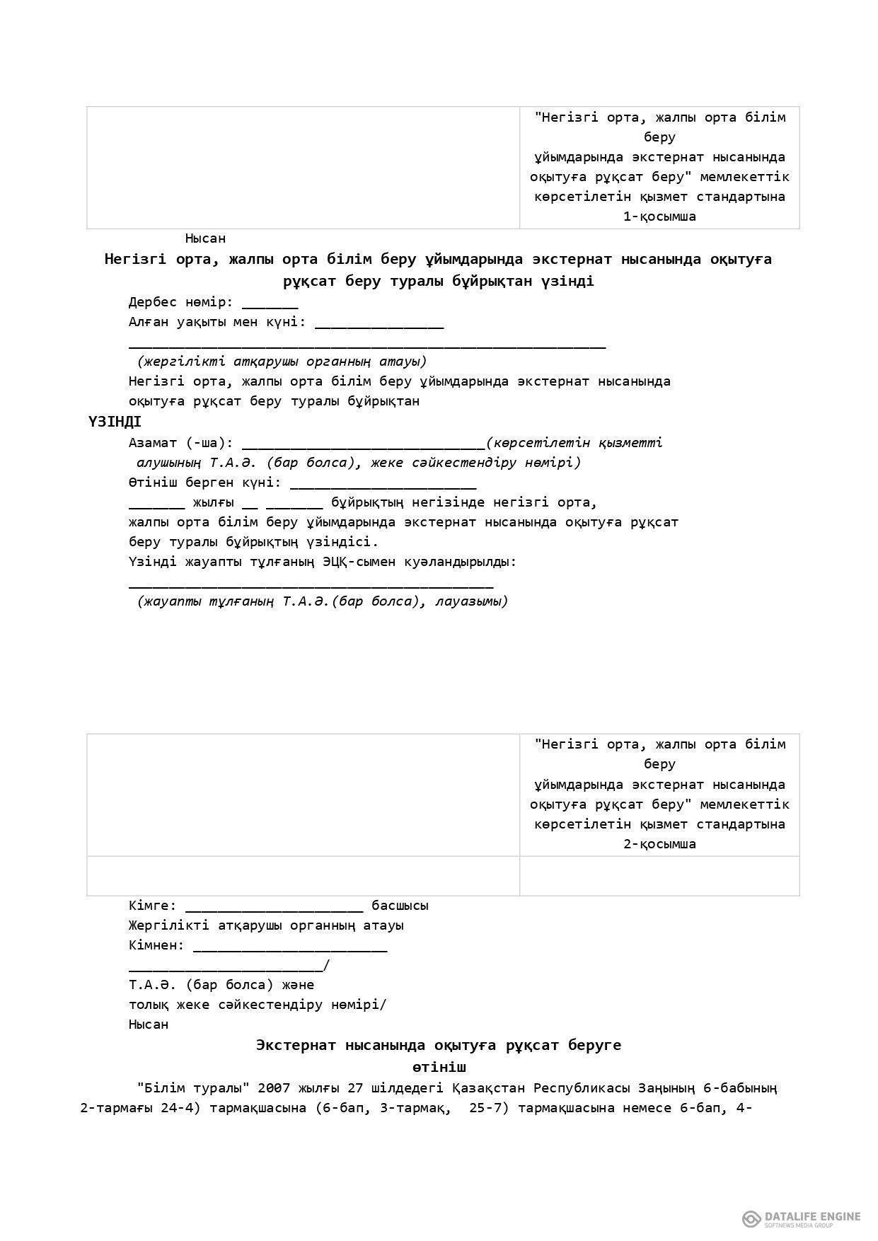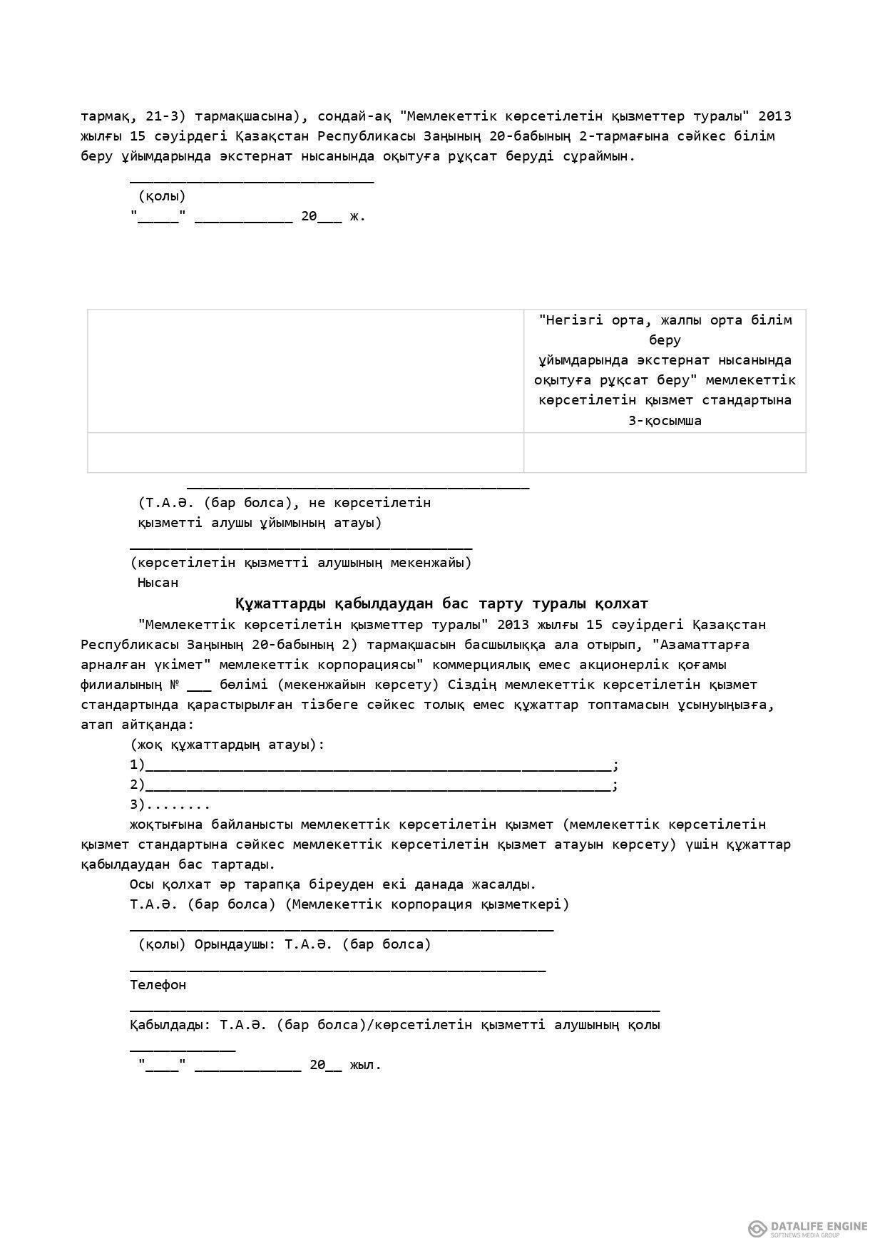 Білім беру ұйымына қабылдауға, экстернат нысанында оқытуға, Білімі туралы құжаттың телнұсқасын алуға өтінішті төмендегі сілтемеден көшіре аласыз