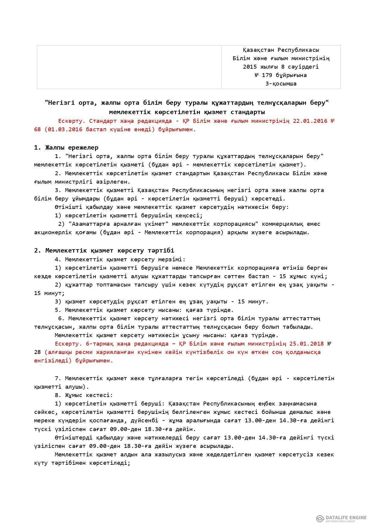 №180 ЖББ мектеп бойынша Орта білім беру саласында мемлекеттік көрсетілетін қызметтер стандарттары