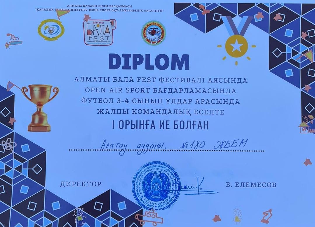 Алматы “БАЛА FEST” фестиваль аясында “OPEN AIR SPORT” бағдарламасындағы футбол жарысында 3-4 сынып ұлдар командасы 🏆 І орынды иеленді.