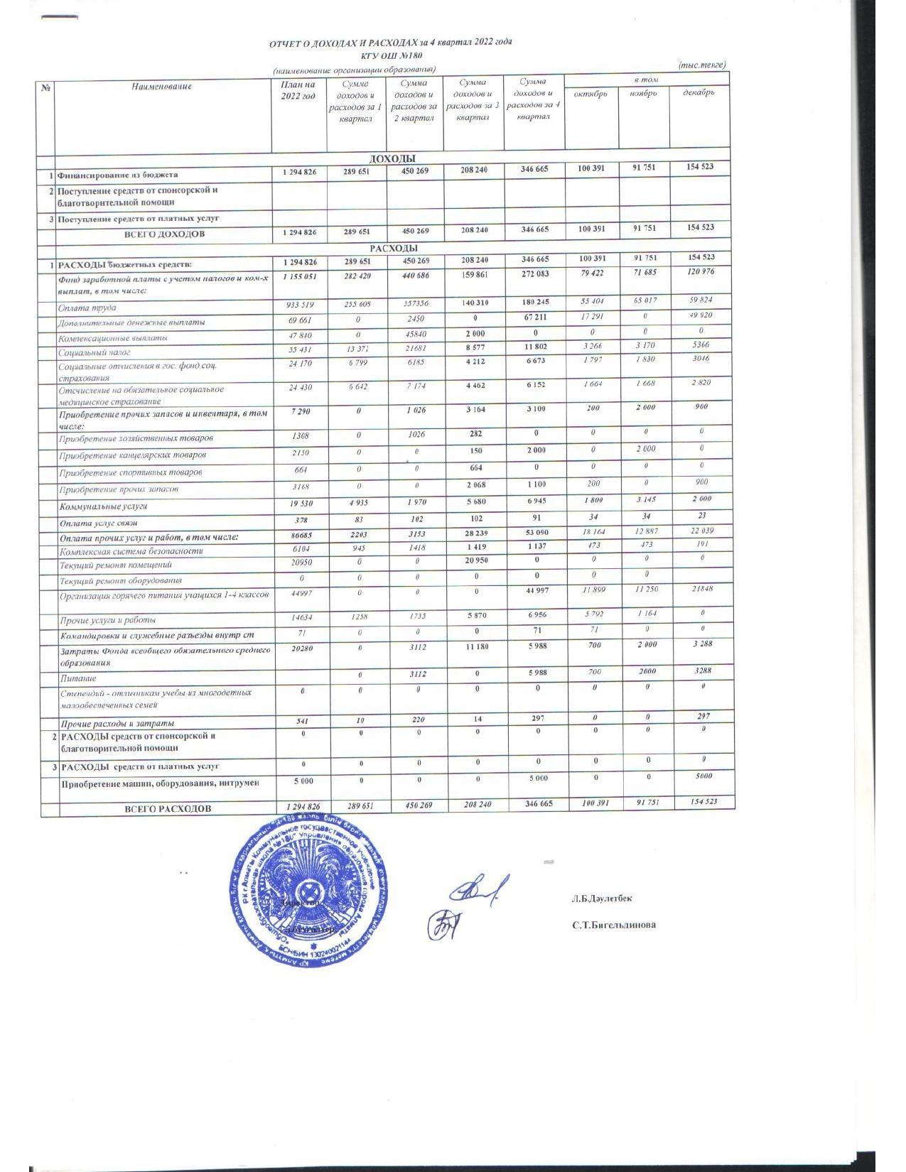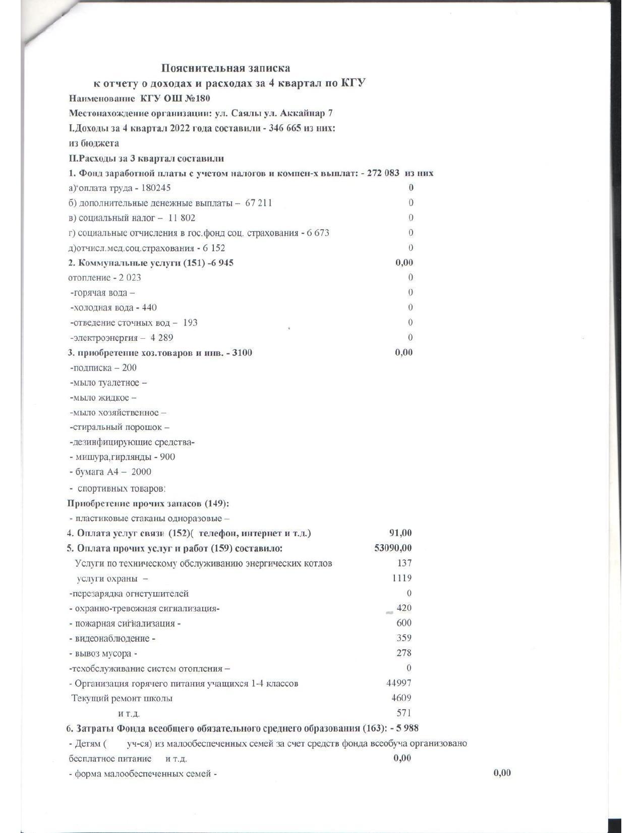 2022 жылғы 4 тоқсандағы кірістер мен шығыстар туралы есеп/Отчет о доходах и расходах за IV квартал 2022 года » 180 мектеп