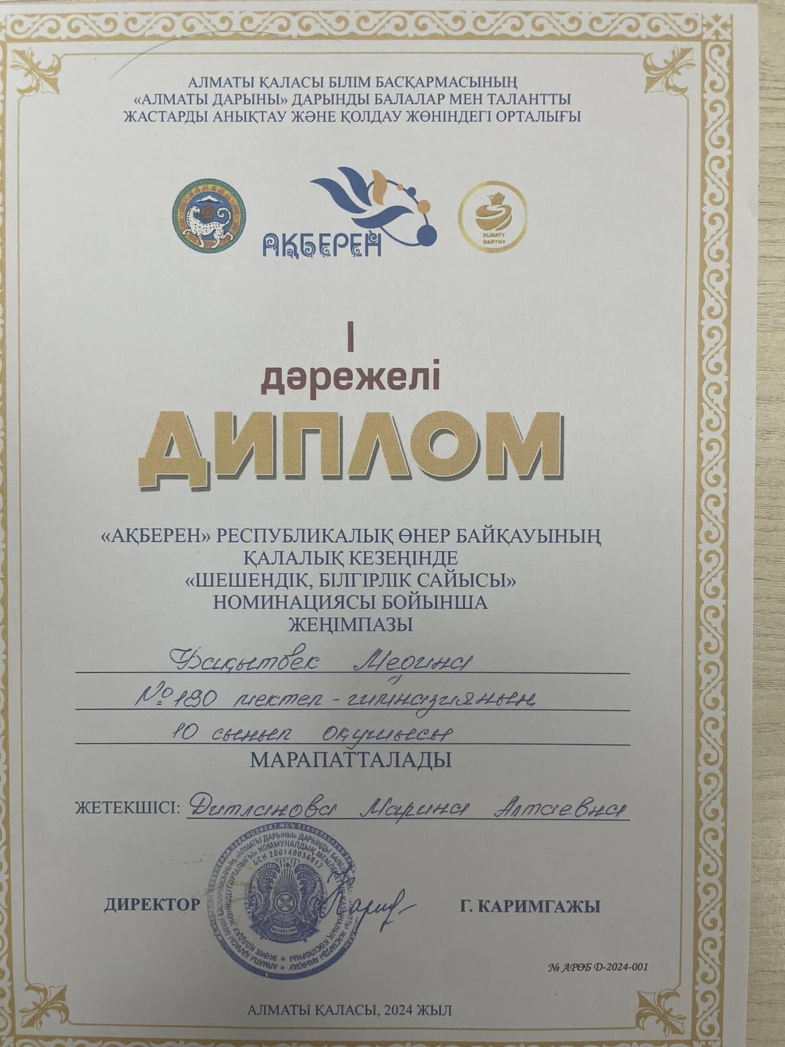 Алматы қаласы Білім басқармасының “Алматы Дарыны” дарынды балалар мен талантты жастарды анықтау және қолдау жөніндегі орталығың ұйымдастыруымен өткен “Ақберен” Республикалық өнер байқауының қалалық кезеңінде “Шешендік, білгірлік сайысы” номинациясы бойынша 180 мектеп- гимназияның 10 “А” сынып оқушысы Бақытбек Медина І дәрежелі дипломмен марапатталды. Жетекшісі: қазақ тілі мен әдебиеті пәні мұғалімі Дилтанова Марина Алтаевна. Құттықтаймыз!