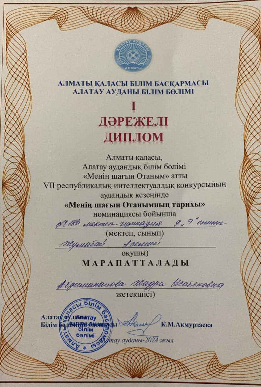 25 қазан -Республика күніне орай өткізілген, Алатау аудандық білім бөлімі “Менің шағын Отаным” атты VII республикалық интеллектуалдық конкурсының аудандық кезеңінде “ Менің шағын Отанымның тарихы” номинациясы бойынша 9 Г сынып оқушысы Жұмабай Асемай 1 дәрежелі дипломмен марапатталып, қалаға жолдама алды.