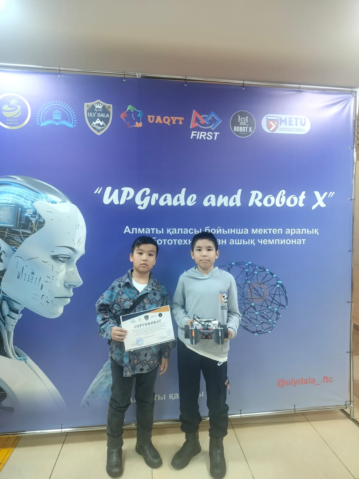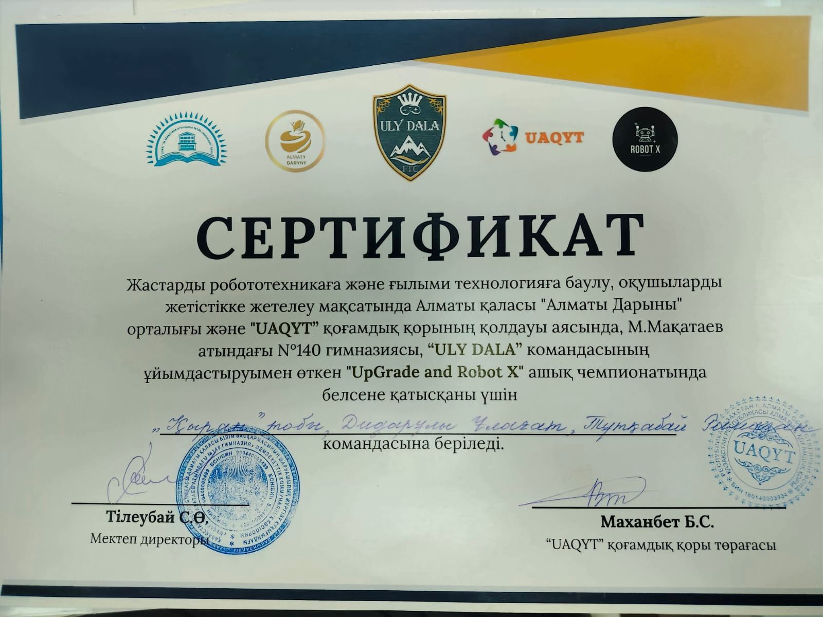 Жастарды робототехникаға және ғылыми технологияға баулу, оқушыларды жетістікке жетелеу мақсатында Алматы қаласы “Алматы дарыны” орталығы және “UAQYT” қоғамдық қорының қолдауы аясында М.Мақатаев атындағы 140 гимназиясы “ULY DALA” командасының ұйымдастыруымен өткен “UpGrade and Robot X” ашық чемпионатында белсене қатысқаны үшін мектебіміздің 5 сынып оқушыларынан құралған “Қыран