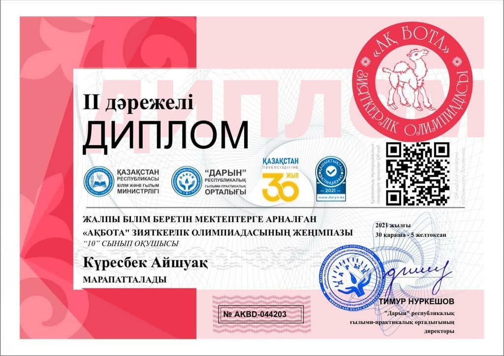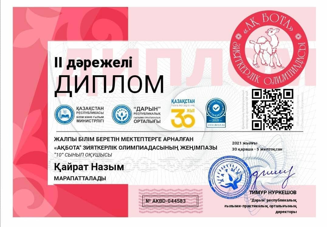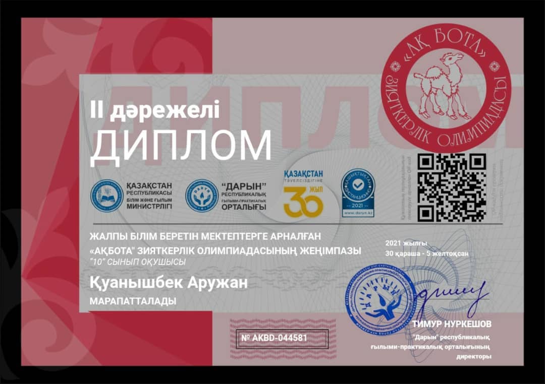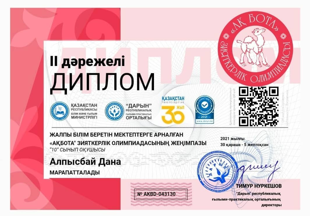 180 мектеп » Оқушыларға » Оқушылар жетістіктері » Ақбота зияткерлік олимпиадасында 180 жалпы білім беретін мектептің оқушылары ІІ дәрежелі дипломдармен марапатталады.