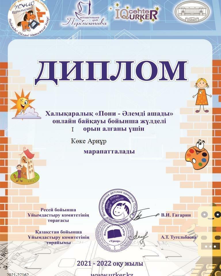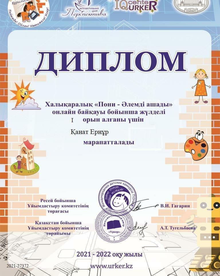 03 желтоқсан 2021 20 1 2 3 4 5 "Пони-әлемді ашады" байқауы бойынша жүлделі орындарға ие болған 4 к сынып оқушылары. Халықаралық "Пони-әлемді ашады" байқауы бойынша жүлделі орындарға ие болған 4 к сынып оқушылары.Сынып жетекшісі Жумабек Алтынай.@edu.almaty @almaty_mektepteri Осы беттің QR-коды:QR-код этой страницы: