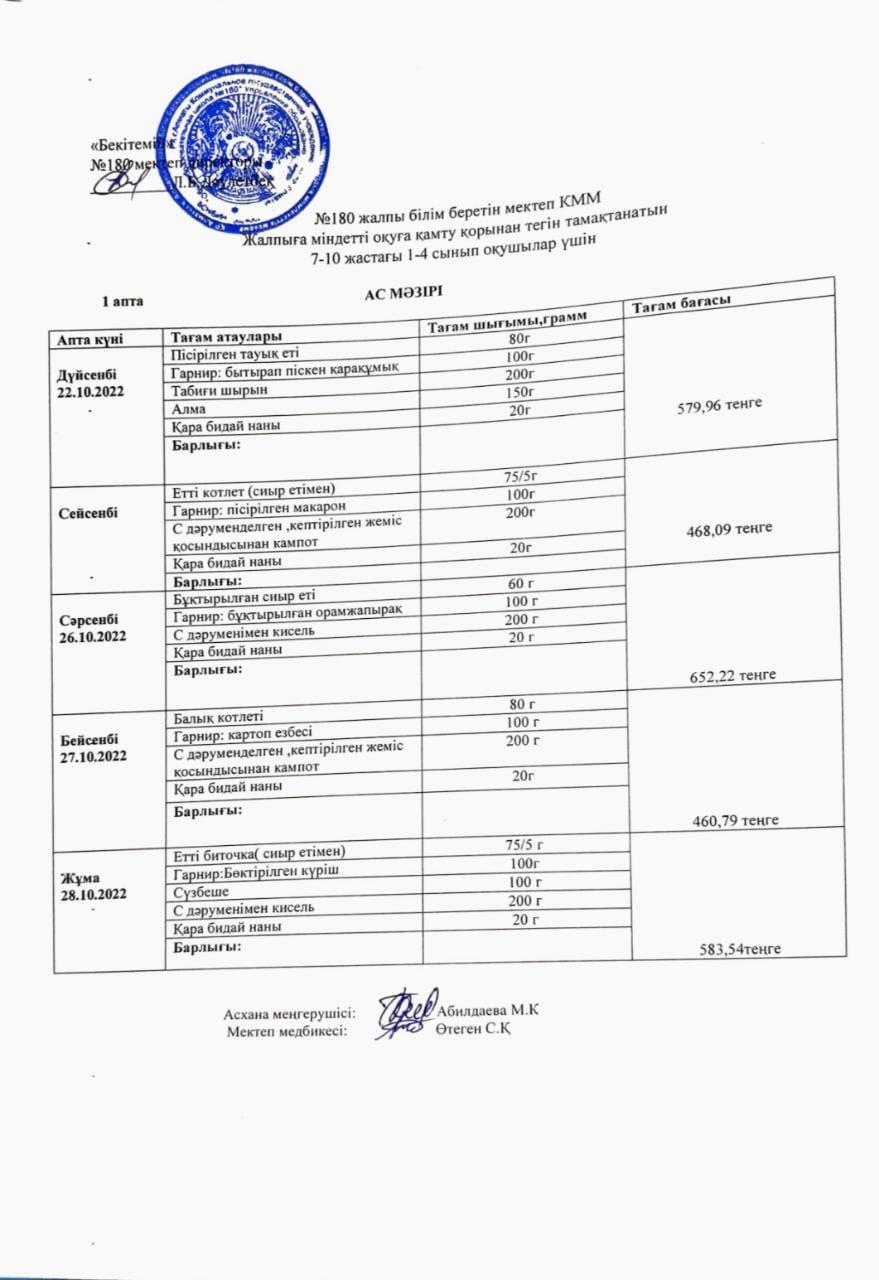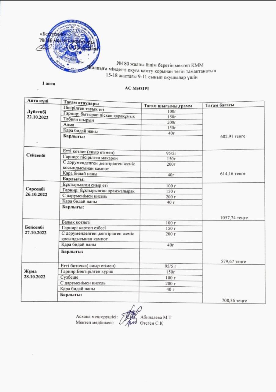 Ас мәзірі І апта 1-күн 22.10.2022 ж » 180 мектеп