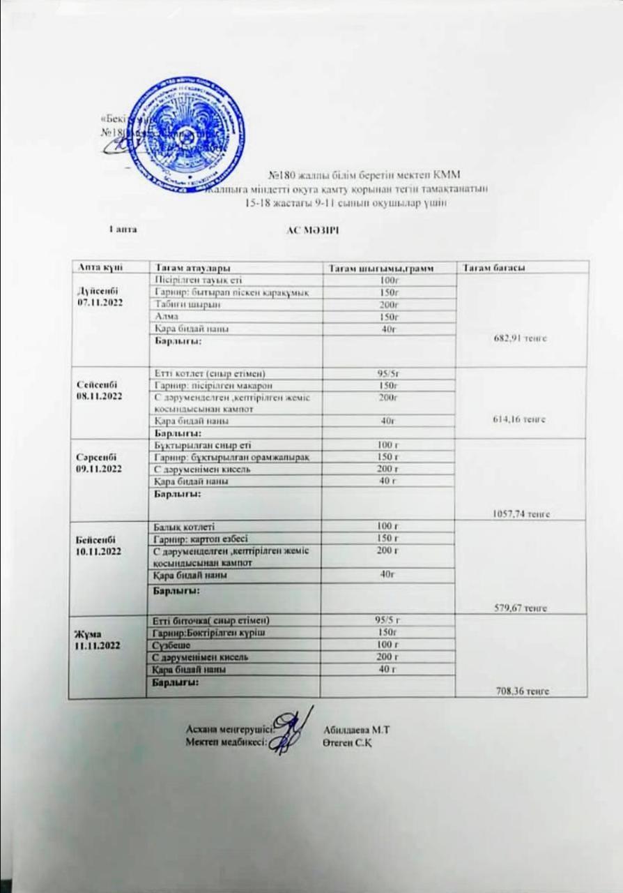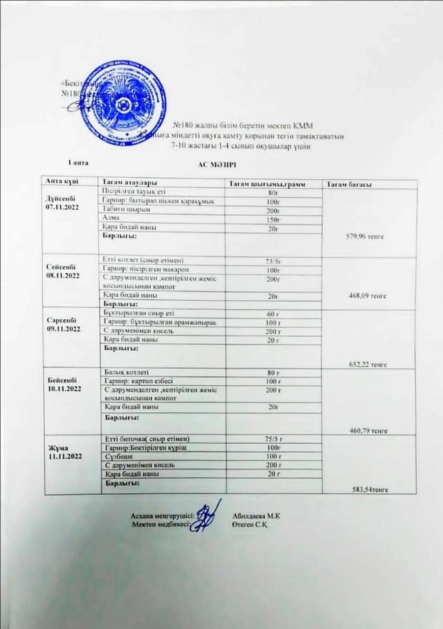 Ас мәзірі І апта 1-күн 07.11.2022ж » 180 мектеп