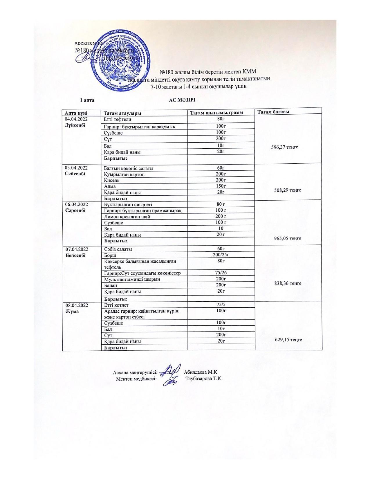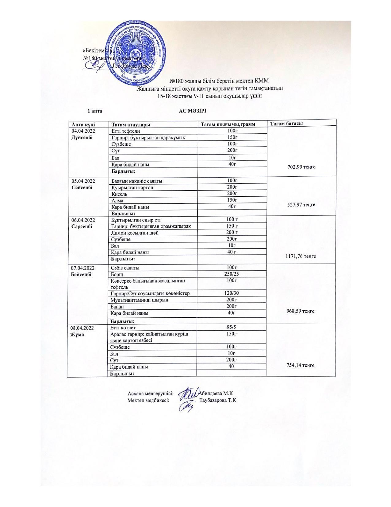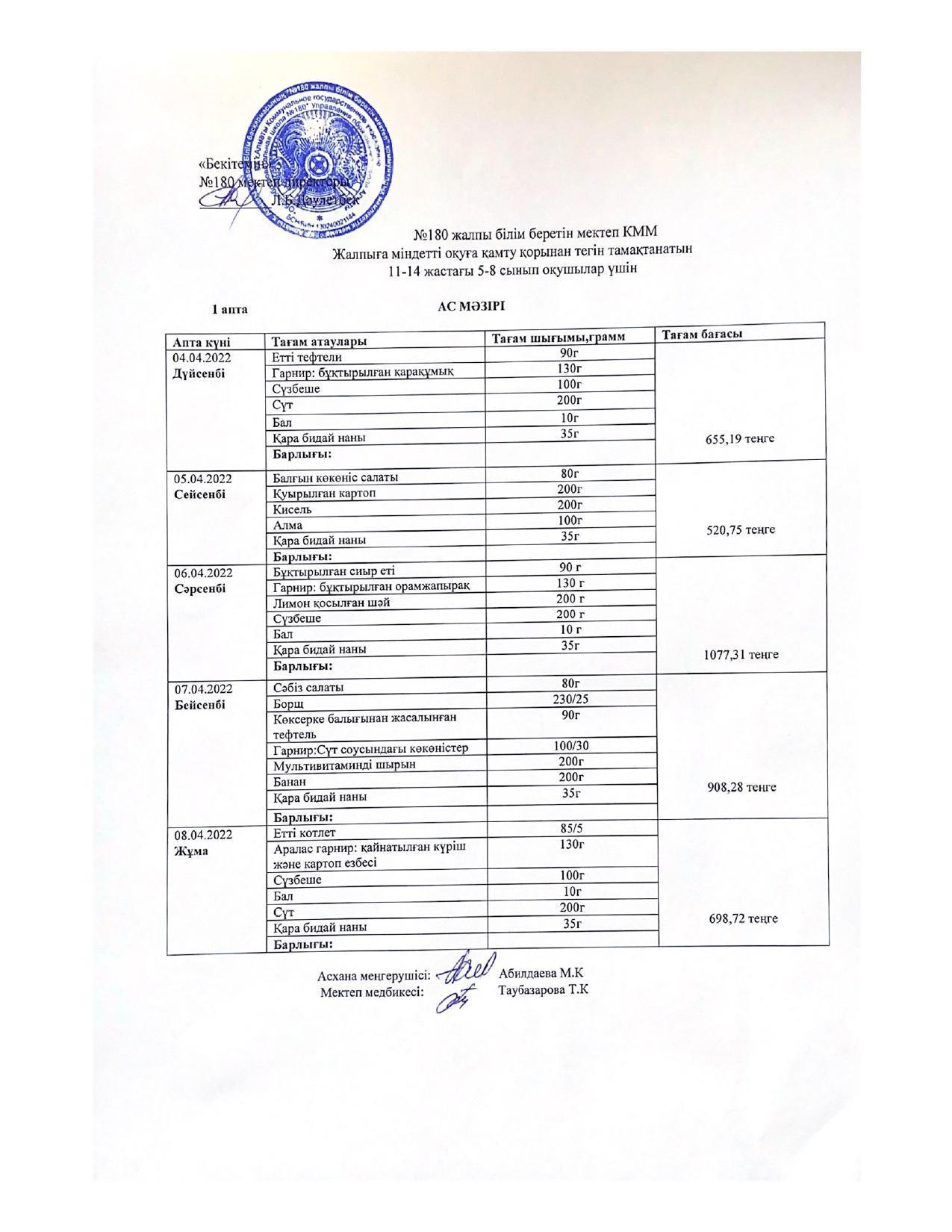 Ас мәзірі I апта 1-күн 04.04.2022 » 180 мектеп