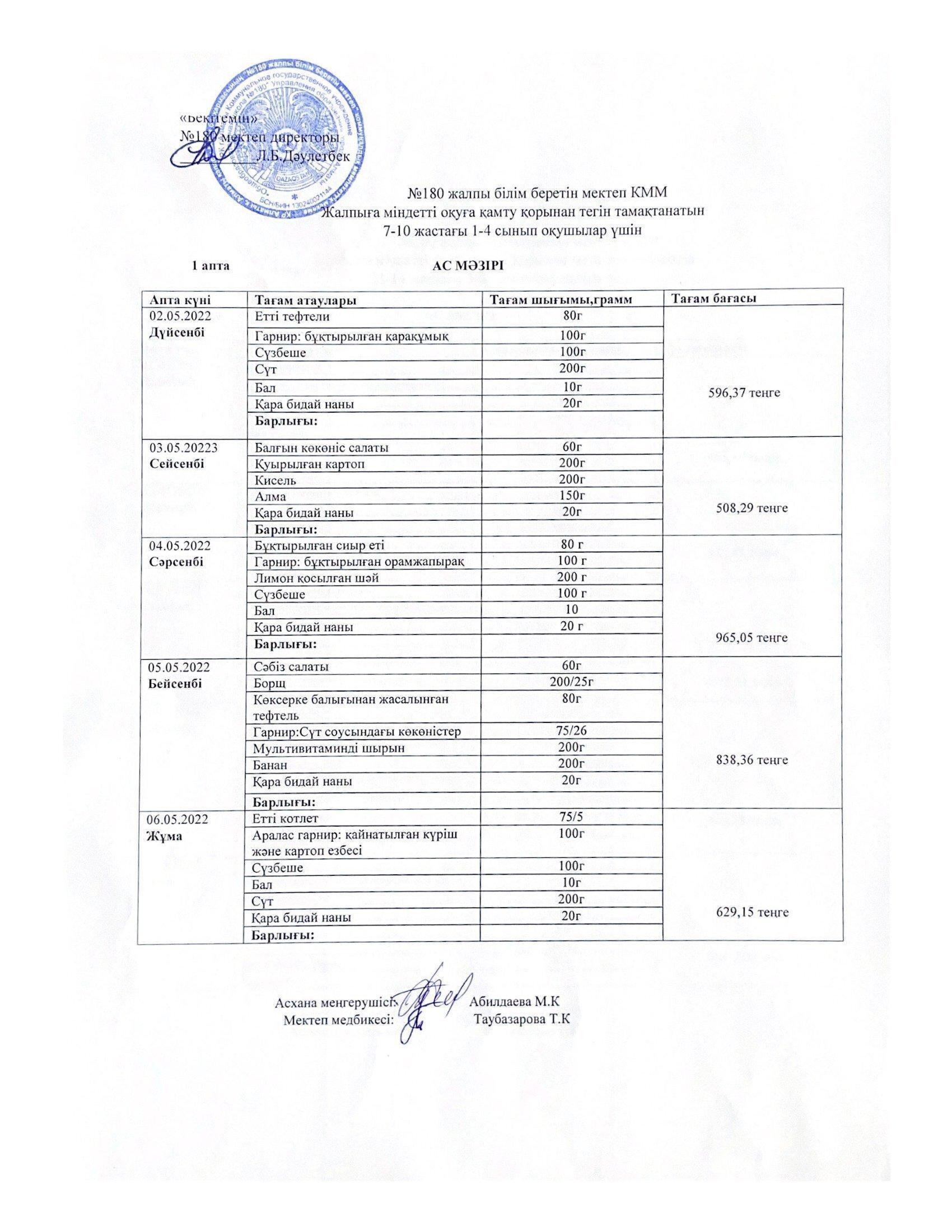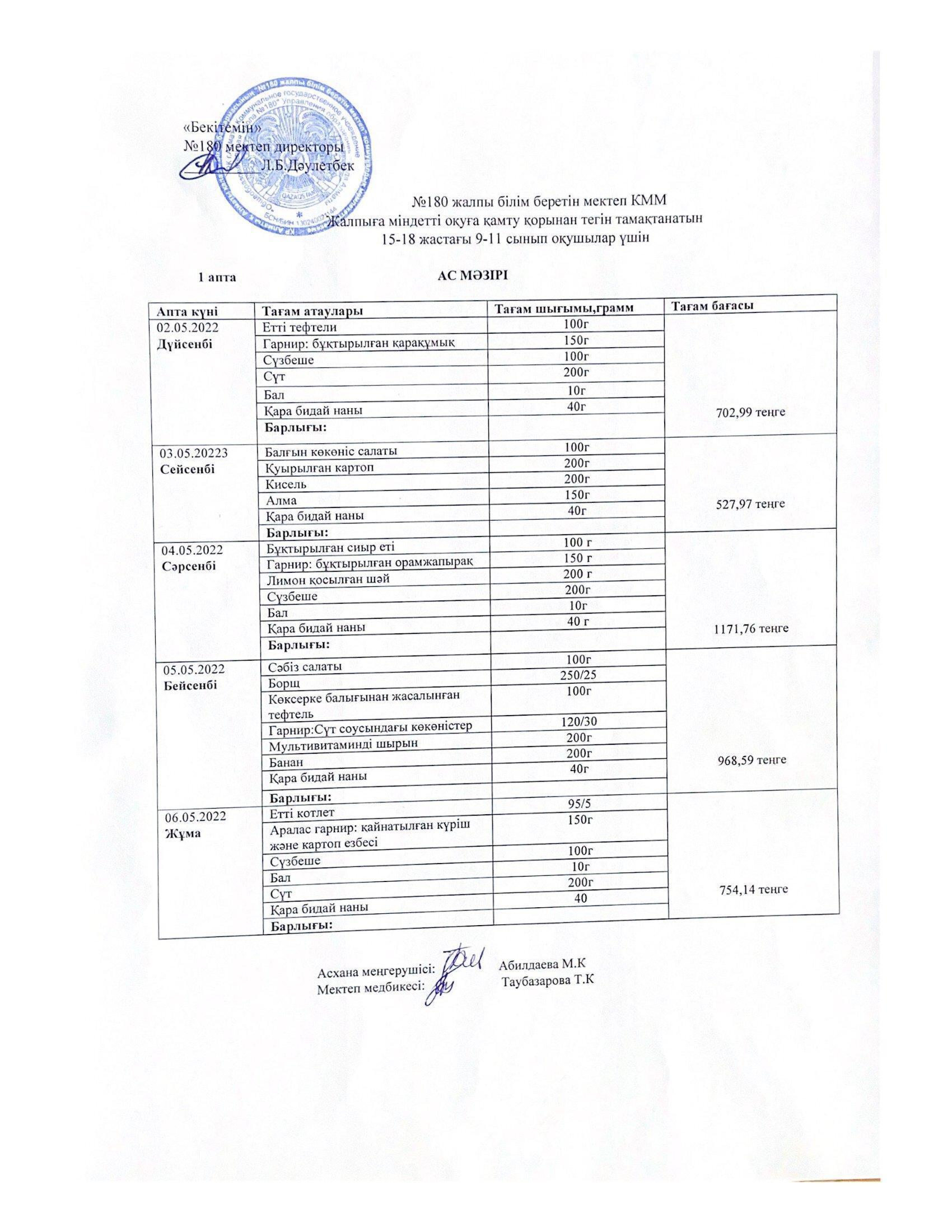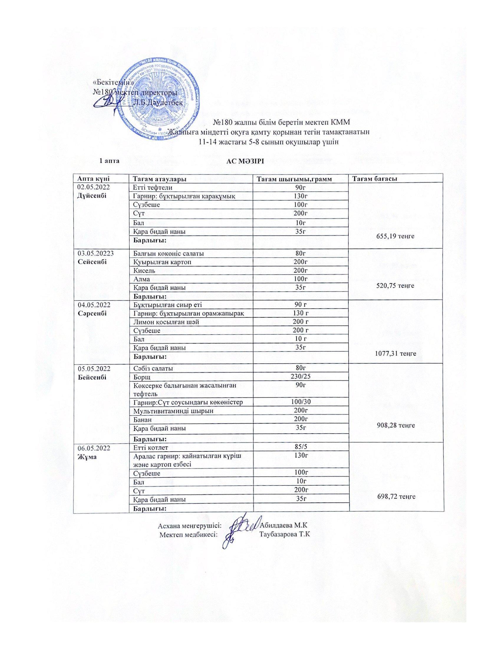 Ас мәзірі I апта 2-күн 03.05.2022 » 180 мектеп